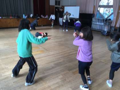 34年生 体育 表現運動 公開日 2025/01/14 更新日 2025/01/14 各学年から 34年生が表現運動に取り組んでいました。今日は、その1時間目。 冷たい水やお湯、ねばねばの水を掛け合っていました。 水がかからないように上手に逃げたり、顔をぬぐったり、ねばねばに足を取られて動けなくなったりと想像力を働かせていました。