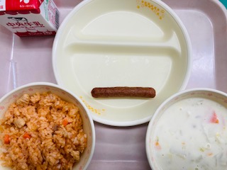 今日の給食は『チキンライス、牛乳、ウインナー、ポタージュスープ』です。とても美味しかったです。ごちそうさまでした!