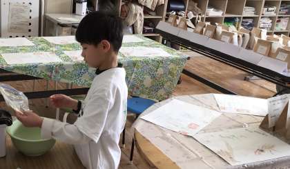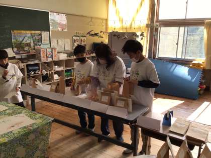 今日はともえポップコーンショップの開店日です。これまで、どんな味付けにするか、何グラムをいくらで販売するかなどを話し合って決め、練習を重ねてきました。開店日の今日は、注文券に書かれた注文に対して間違いのないように確認しながら、協力してポップコーンを作りました。がんばってお世話をして収穫したポップコーントウモロコシ。たくさんの方々に食べていただくことができ、子どもたちはとても嬉しそうでした。ぜひ感想をお聞かせください。