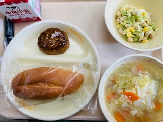 今日の給食は『米粉パン、牛乳、照り焼きハンバーグ、ビーンズサラダ、パスタスープ、コーヒー牛乳の素』です。とても美味しかったです。ごちそうさまでした!