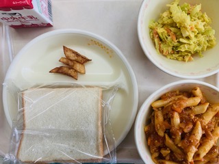 今日の給食は『スライスパン、牛乳、フライドポテト、コロネーションチキンサンド、ペンネのミートソース』です。とても美味しかったです。ごちそうさまでした!