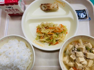 今日の給食は『ごはん、牛乳、のり佃煮、ちくわの天ぷら、切干しだいこんのごま酢あえ、高野豆腐のうま煮』です。とても美味しかったです。ごちそうさまでした!