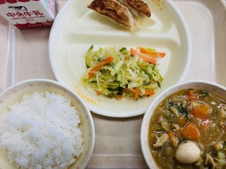 今日の給食は『ごはん、牛乳、ぎょうざ、バンサンスー、八宝菜』です。とても美味しかったです。ごちそうさまでした!