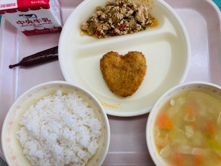 今日の給食は『麦ごはん、牛乳、かぼちゃコロッケ、ガパオライス、コンソメスープ、ココア牛乳の素』です。とても美味しかったです。ごちそうさまでした!