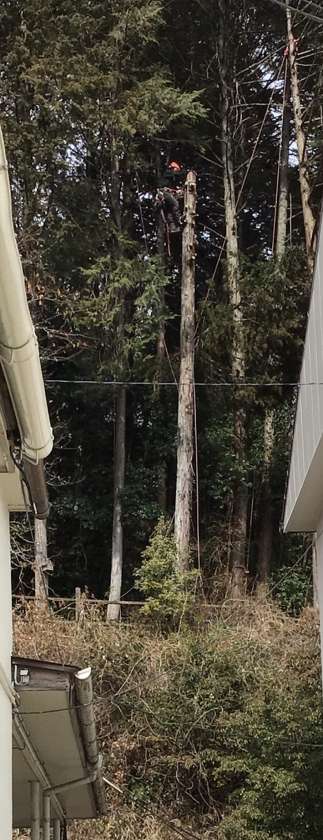 2月18日(火)樹木の伐採作業を興味深く見守る5、6年生 公開日 2025/02/18 更新日 2025/02/18 各学年から 昨日から、がんばり山などの樹木を伐採する作業が行われています。18日(火)の4時間目には、校庭で体育の授業をしていた5、6年生が、「すごーい」「あんな高いところで手を離してるよ」など、作業の様子を見守っていました。どの方向にどう倒すのかなど、プロの技だと感じました。