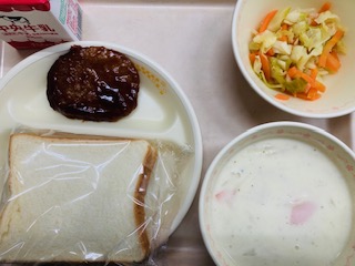 3月3日給食 公開日 2025/03/03 更新日 2025/03/03 お知らせ 今日の給食は『スライスパン、牛乳、ハンバーグサンド、キャベツソテー、ポタージュスープ』です。とても美味しかったです。ごちそうさまでした!
