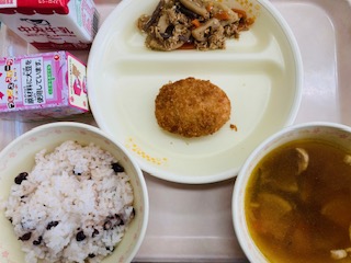 18日の給食は卒業祝い献立でした。『赤飯、牛乳、えびカツ、れんこんのきんぴら、かしわ汁、米粉のケーキ(いちご豆乳クリーム)』です。とても美味しかったです。ごちそうさまでした!