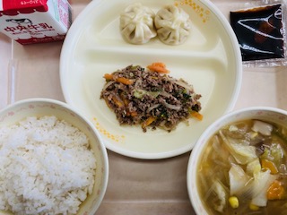 今日の給食は『麦ごはん、牛乳、ショウロンポウ、ビビンバ丼・みそたれ、ワンタンスープ』です。とても美味しかったです。ごちそうさまでした!