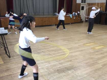 フラフープなどの用具を使って、様々な「体つくり運動」に取り組みました。