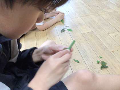 あいにくの雨模様でしたが、集会室で葉っぱのにおいくらべやスイバで10円玉をぴかぴかにしたり、クイズを出してもらったりと楽しくためになる時間を過ごしました。