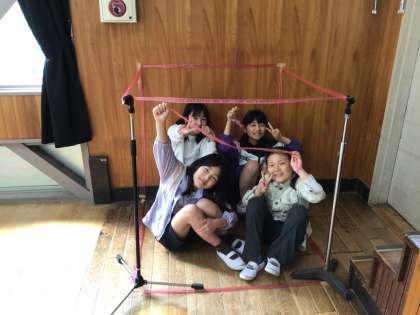 5年生は算数の「体積」の学習で、ビニール紐とマイクスタンドで1立方メートルのスペースを作り、その体積の大きさを体感しました。5年生4人がすっかり収まってしまいました。