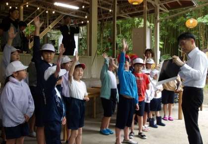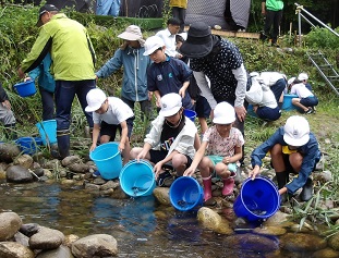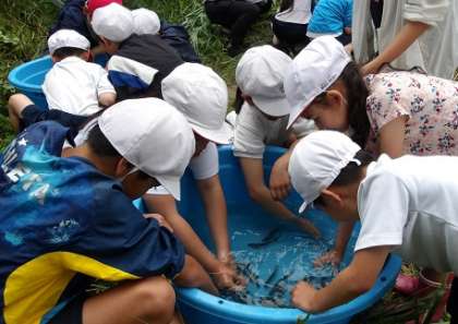 巴川漁業協同組合様のご厚意により、「鮎の放流体験」をさせていただきました。はじめに、愛知県豊田加茂農林水産事務所の方が、「愛知の魚」や「鮎の生態」について、イラストを見せながらとても分かりやすく教えてくだいました。子ども達は笑顔で鮎を見送りながら放流していました。放流した後は、鮎を触らせてもらいました。「水で手を冷やして、鮎がやけどしないように」と、教えていただいたことに気を付けて触りました。「鮎はスイカの皮のにおいがする」と、体験したからこそ味わえる気づきができました。