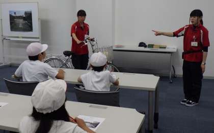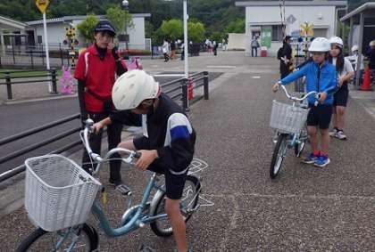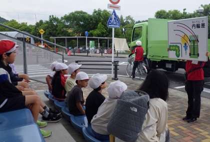 本物のトラックで内輪差の危険を知り、施設内のコースで自転車の乗り方について体験を通して学びました。