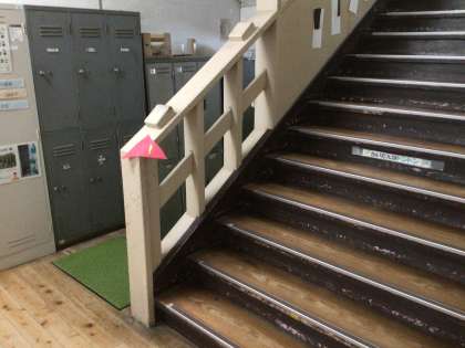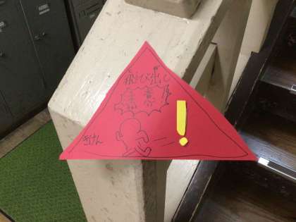 校舎の階段に、何やら三角のモノが…。