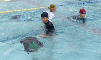 3・4年生は、「だるま浮き」で体の浮力を体感しながら、息継ぎの練習にも取り組みました。