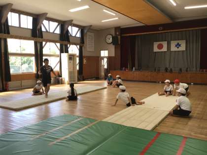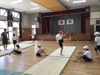 はじめは跳ばずにゴムをまたぐようにして、踏み切る足と振り上げる足の使い方を確認しました。そして、先生の実演と説明をよく聞いて、実際にジャンプしてみました。足の使い方の確認と実演を交えた説明で、フォームのイメージができて、子ども達はスムーズな動きでゴムを飛び越していました。