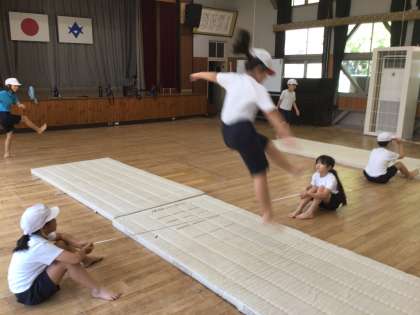 3・4年生の体育は「ゴム跳び」です。ゴム跳びは、走り高跳びの「はさみ跳び」の基礎を養う運動です。