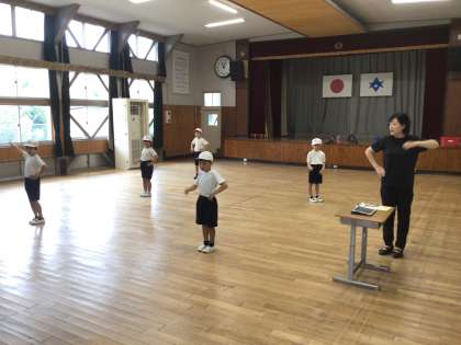 はじめは先生の動きを真似しながら、手拍子に合わせて練習しました。何回か練習して、最後は音楽に合わせて踊りました。まだまだ体の動きにぎこちなさはありますが、笑顔で踊る2年生の姿がとても素敵でした。