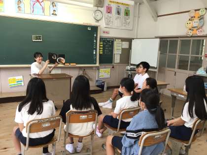 5・6年生は、担任の先生の読み聞かせでした。様々なモノにペイントを施した写真の絵本でした。拳に描かれたソフトクリームや卵に描かれたコーヒーカップ、まるで本物のようなペイントの数々に、子ども達は夢中でした。