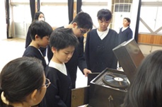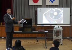 校長先生からは、「勉強は、友達と力を合わせて挑戦する『謎解き』」というお話がありました。そして、校長先生が持ってきた謎の木箱(蓄音機)について、みんなで気づいたことを出し合いながら、「謎解き」をしました。みんなの気づきを集めて、謎の木箱の正体を明らかにすることができました。