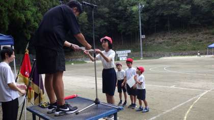 運動会の中で、PTA交通安全標語の表彰をしました。子ども達が応募した作品の中から、インターネットを使った保護者や教職員の投票で、入賞作品が決まりました。表彰されたた3人は、会場からの拍手にとてもうれしそうでした。