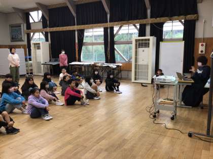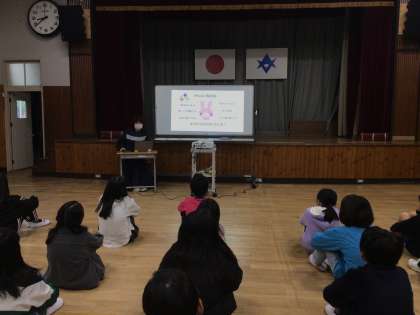 学生時代の「病院実習」で出会った子の病気と闘う様子や、「病院の外って、どんなふうなんだろう?」というその子との会話のお話を紹介してくれました。全員がとても真剣にお話を聞いていました。今朝のお話から、「健康で過ごせている『ふつうの毎日』は、キラキラ輝いている」ということを、全校のみんなで見つめ直すことができました。