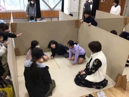PTA研修安全部の研修会を行いました。市役所の防災対策課の方を講師にお招きし、避難所での段ボールの仕切りやベット、トイレの組み立て体験を行いました。組み立て手順を教えていただいて、早速みんなで挑戦しました。出来上がると、早速その中に入ってみました。