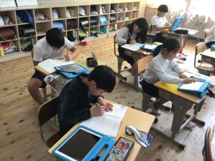 3・4年生の理科は、秋の生き物の学習で、校舎の周りの植物や昆虫などの観察を行いました。コンクリートブロックの下のカタツムリ、校舎裏の土手に咲くオレンジの花など、春や夏の観察の時とは違う沢山の生き物を見つけ、タブレットで撮影しました。教室に戻り、ノートに生き物の特徴や気づいた事を書き加えながら記録しました。改めて身の回りを観察すると、さまざまな発見がある事を、体験を通して学ぶことができました。