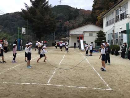 「短縄跳び」の次は、縦割り班対抗の「長縄跳び」でした。優勝は2班で記録は「127回」でした。この競技は「跳ぶ子」だけでなく「縄を回す子」も体力を使う競技でした。みんなで声に出して記録を数えて、「班の一体感」を感じながら頑張りました。