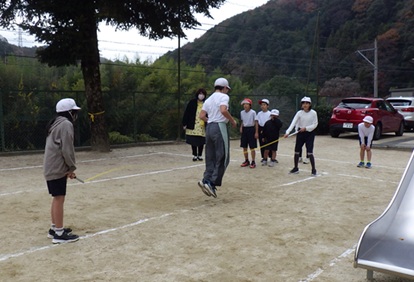 保護者有志の皆様もオープン参加で長縄跳びに挑戦しました。記録は「253回」でした。この大記録は、子ども達の憧れです!