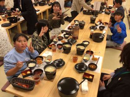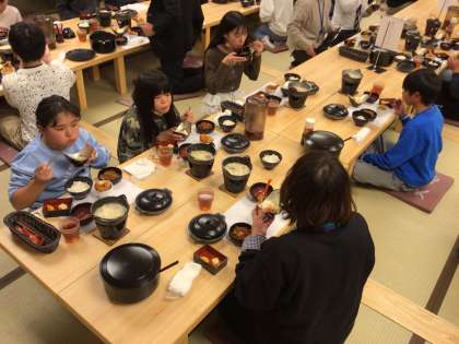 ホテルに着いて、夕食の時間です。ハンバーグや海老フライ、プチデザートなど、ボリューム満点のメニューで、子ども達も大満足でした。夕食会場には追分小の子達が一番最初に集合していました。しおりを見て早めの行動できました。