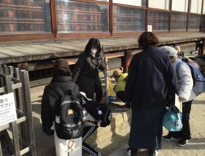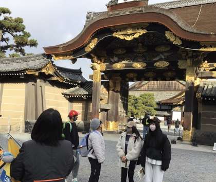 学校別コースの最初の目的地は二条城でした。子ども達は、絢爛豪華な二条城に、徳川将軍家の権威の大きさを感じていました。大政奉還の舞台となった大広間や、縁側の下にある鶯張りの仕組みも見学できました。社会科で学習した内容の「本物」を見てくる事ができました。