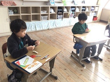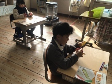 2年生の算数では、「分数」の学習に入りました。今日は、「一枚の四角形を『同じ形』で『二つ』に分ける」という課題に取り組みました。「同じ形」「二つ」という条件を満たすことができるように、配付された色紙に折り目をつけて、ハサミで切りました。「二分の一にする」ことの意味について、具体物の操作を通して、学ぶことができました。