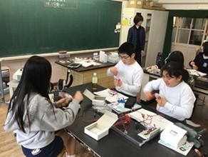 5・6年生の理科では、「電気のしくみ」について学習しています。今日の授業では、はじめに、手回し発電機、乾電池、太陽光パネルなど、それぞれの特徴を話し合い、「いつでも安定的に使えるように電気を貯めておく」ことの大切さを確認しました。そして、手回し発電機で発電した電気をコンデンサーに蓄電する実験を行いました。発電後にコンデンサーを豆電球に繋げてみると明かりが点いて、「発電した電気を貯めて使う」ことを、実感を伴って体験しました。