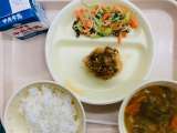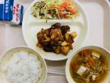 本日の給食は、『ごはん、牛乳、油淋鶏、チンゲンサイのナムル、肉だんごと野菜のスー...