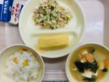 本日の給食は、『栗ごはん、牛乳、厚焼き卵、大豆サラダ、ほうれんそうの白みそ汁』で...