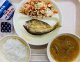 本日の給食は豊田ブランドの日です。『ごはん、牛乳、あゆの一夜干し揚げ、とよたチャ...