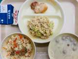 本日の給食は、『ピラフ、牛乳、グリルチキン、切り干し大根サラダ、豆乳スープ』です...