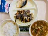 本日の給食は、『ごはん、牛乳、レバーとさつまいもの甘辛煮、昆布和え、具だくさん汁...