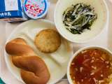 本日の給食は、『ツイストパン、牛乳、野菜入りメンチカツ、海そうサラダ、トマトスー...