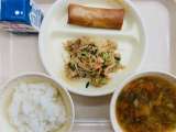 本日の給食は、『ごはん、牛乳、愛知の野菜入り春巻き、チャプチェ、とり肉だんごの中...