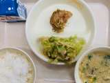 本日の給食は、『ごはん、牛乳、油淋鶏、華風あえ、ワンタン入り卵スープ』です。とて...