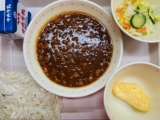 今日の給食は『豊田めん、牛乳、ミートソースかけ、オムレツ、サワーキャベツ』です。...