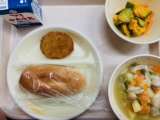 今日の給食は『米粉パン、牛乳、いか香味揚げ、かぼちゃサラダ、野菜のスープ煮』です...