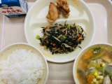 今日の給食は『ごはん、牛乳、とり肉の唐揚げ、ひじきのナムル、ワンタンスープ』です...