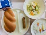 本日の給食は、『ツイストパン、牛乳、あらびきウインナー、フレンチサラダ、さつまい...