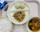 本日の給食は、『白玉うどん、牛乳、ちくわの磯部揚げ、たくわんあえ、野菜たっぷりあ...