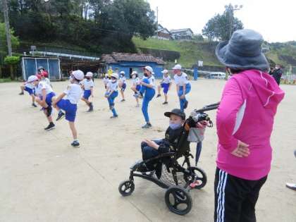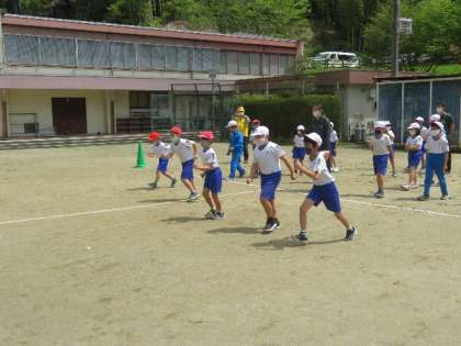 全校児童 オリンピアンによる「走り方教室」の様子です。