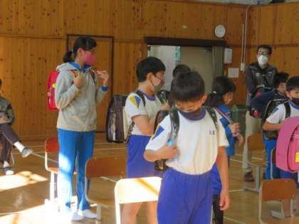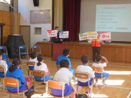 実際に防犯ブザーの使い方を確かめたり、「つみきおに」の合言葉を確認したりしました。