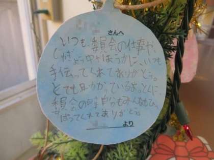 人権週間(12/4〜10)に合わせて実施してきた「あったかの木 パート2」が本日で終了となります。御覧の通り、あったかの木(クリスマスツリー)にたくさんのメッセージが飾られました。これからも、お互いのよさに目を向け、周りの人に感謝する気持ちを忘れない大蔵っ子でいてほしいと思います。